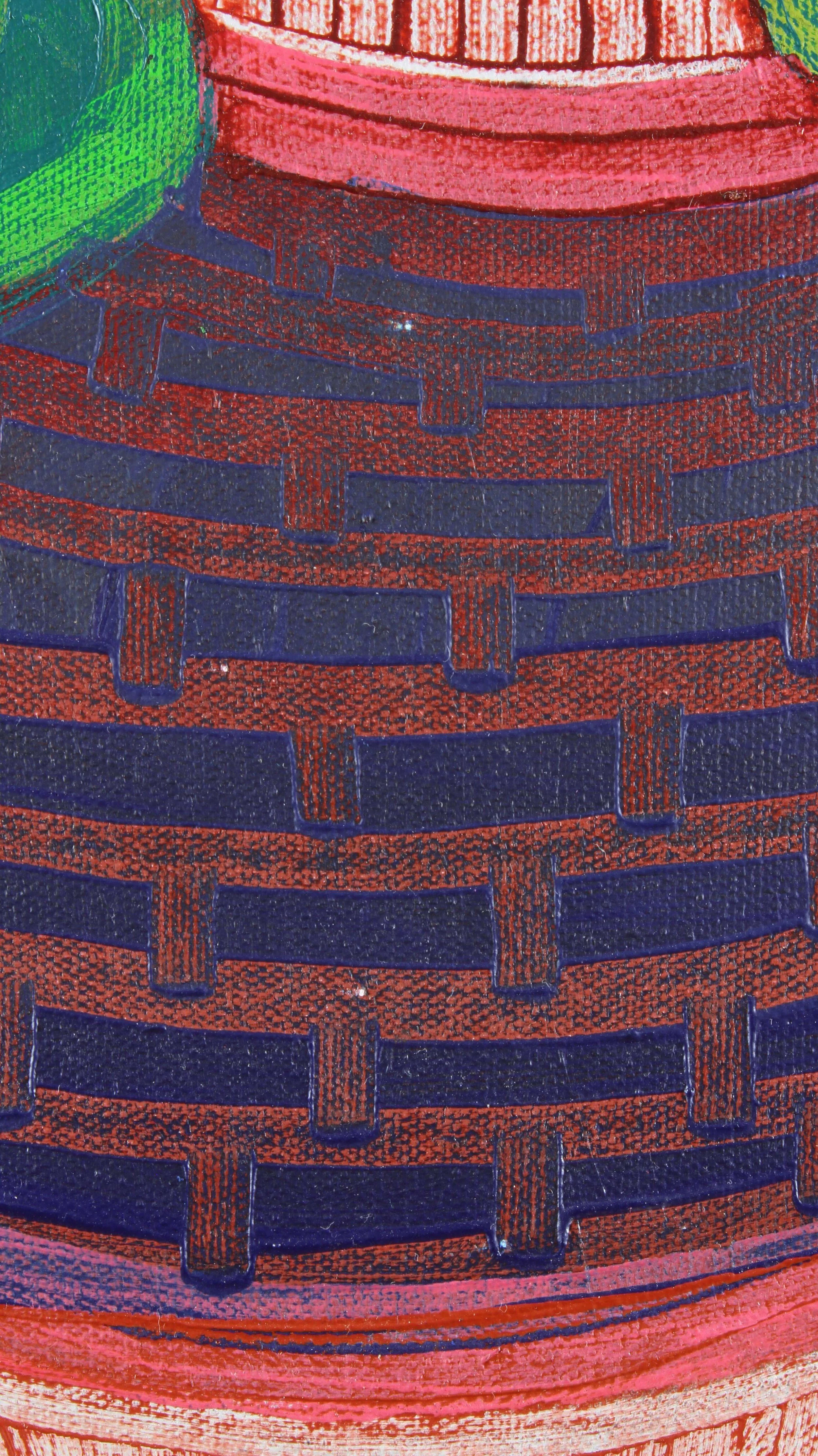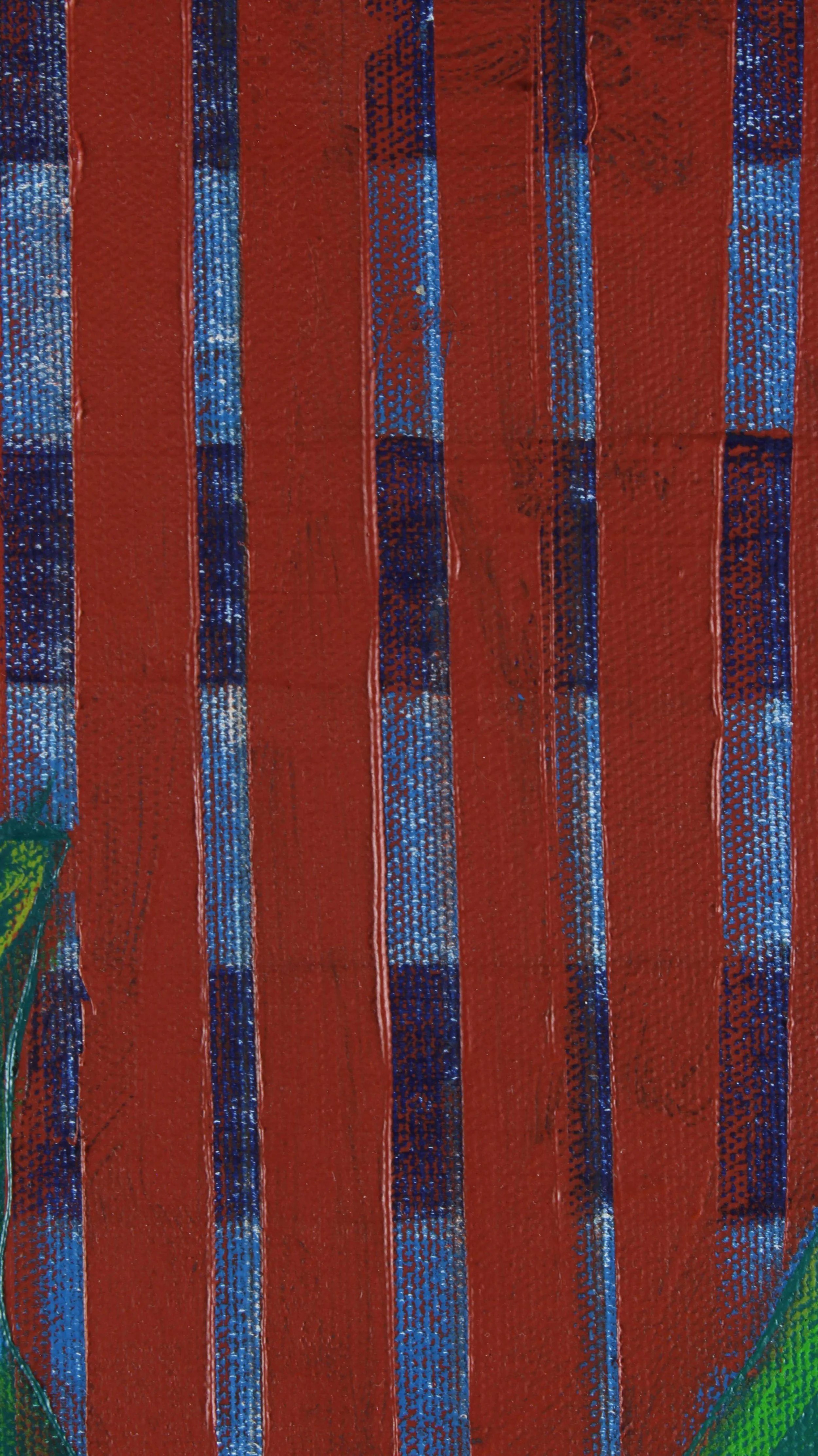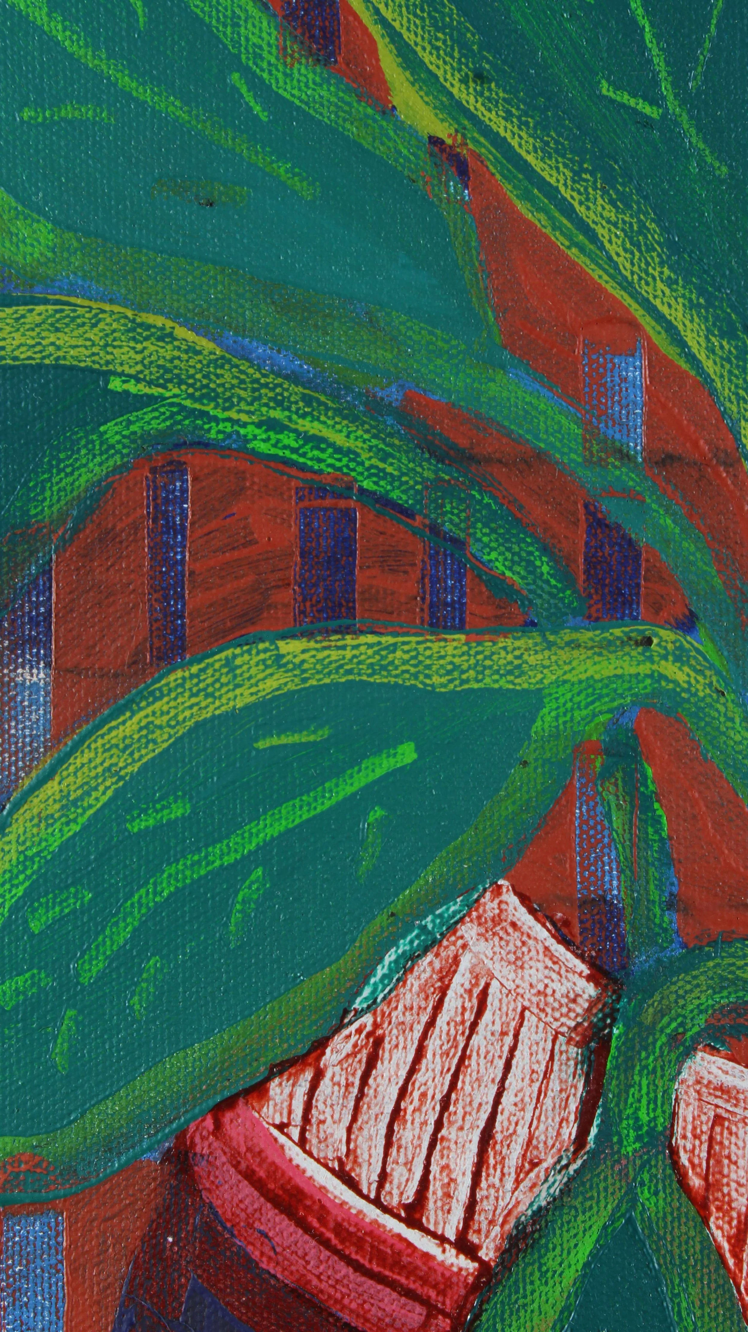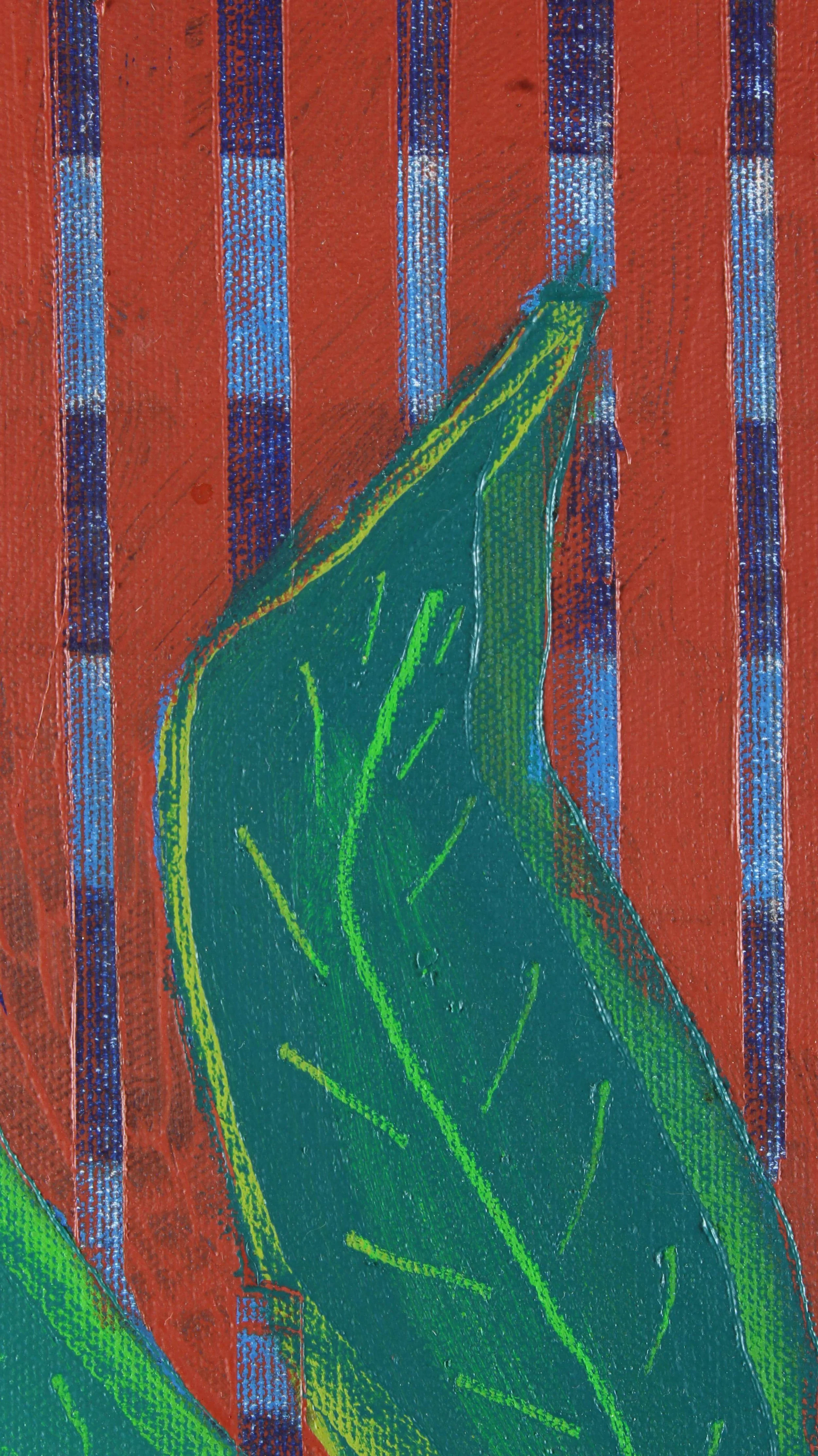In this painting, nature rises with strength and balance within a framework of human order. The plant a symbol of inner growth interlaced overflows the boundaries of the pot that holds it, suggesting an inevitable and vital expansion. The background lines, rigid and constant, contrast with the movement of the leaves, which seem driven by their own rhythm. Nature does not oppose structure; it inhabits and permeates it. The work proposes a reconciliation between form and life, between pattern and emotion. This piece is a visual hymn to the persistence of life even within the most predictable. A reminder that all authentic growth involves transformation, rupture, and beauty.