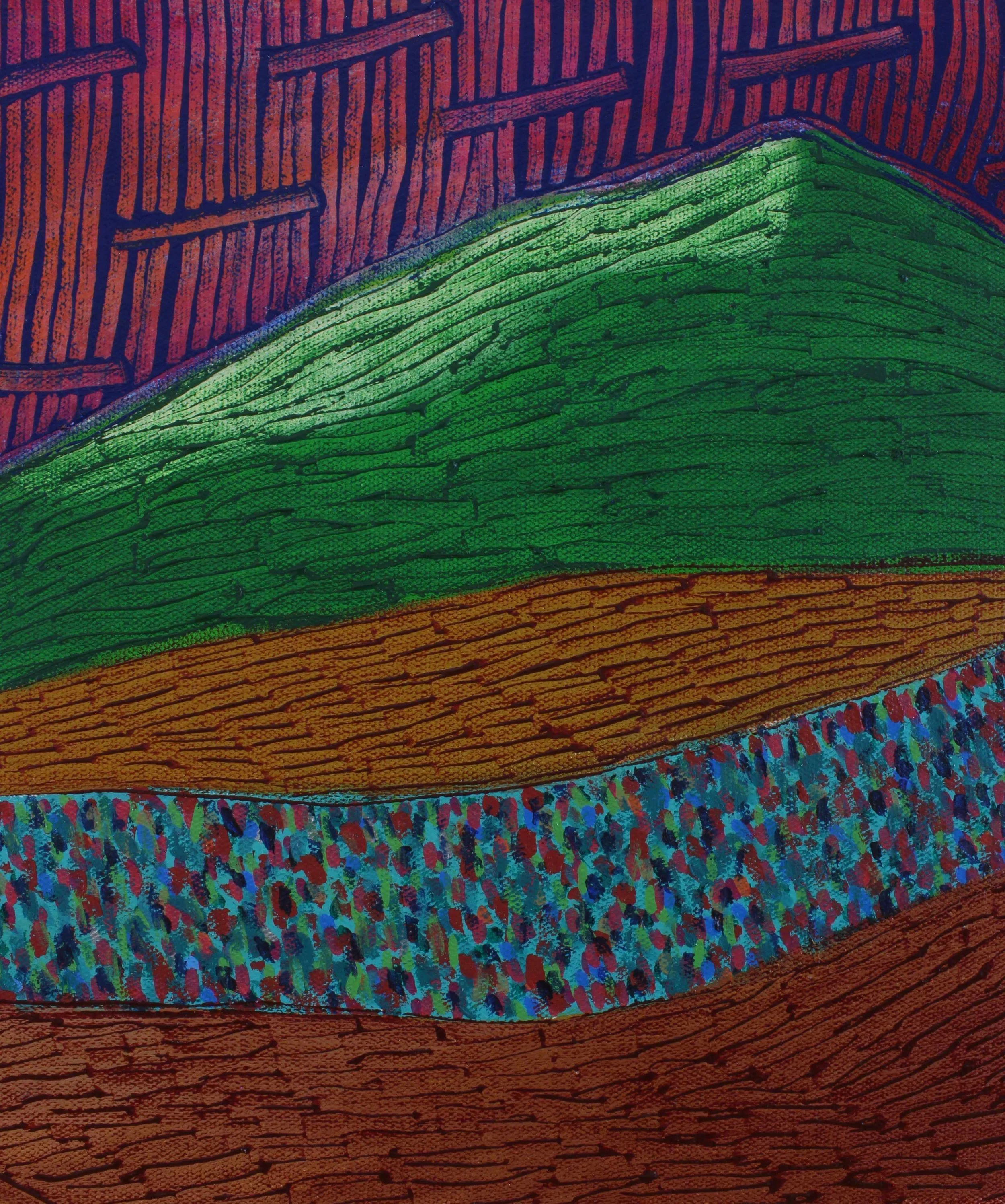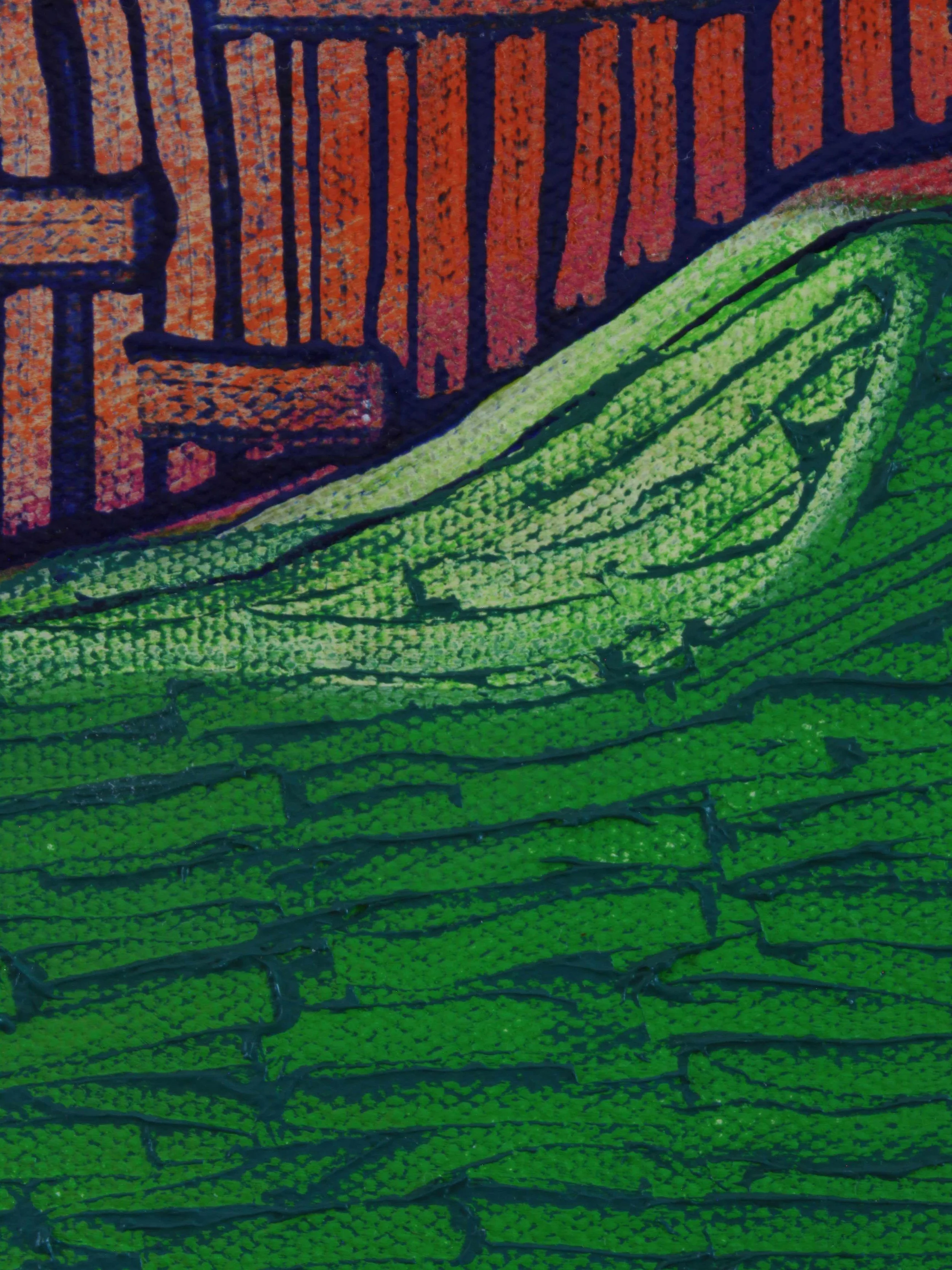 A symphony of colors unfolds in this dreamlike landscape, where the earth and sky entwine in an eternal embrace. Rolling green hills cradle a meadow alive with vibrant whispers, each stroke of color breathing life into the canvas.