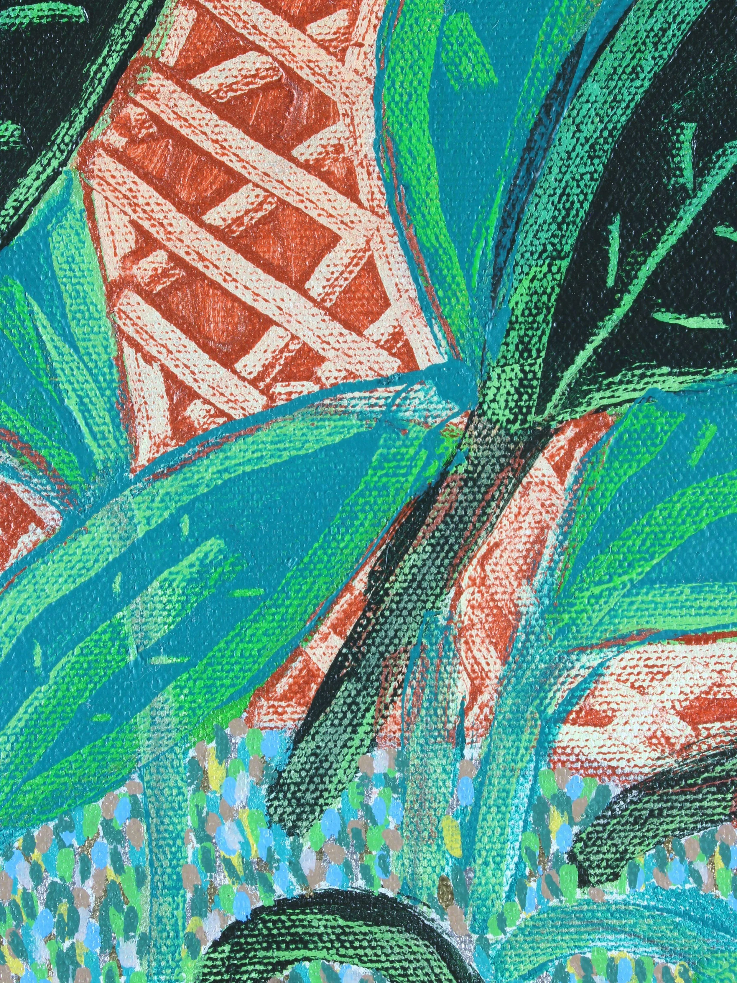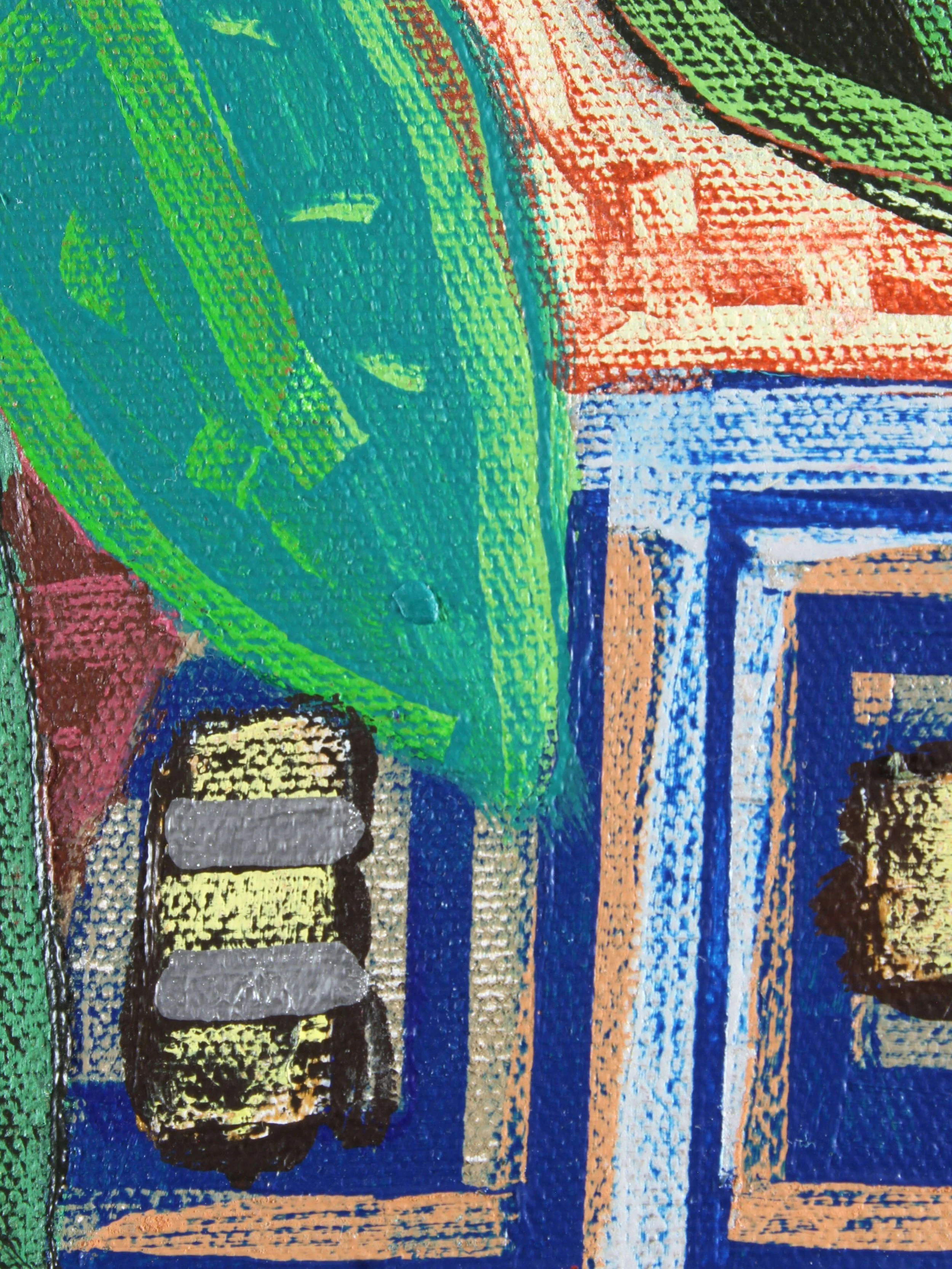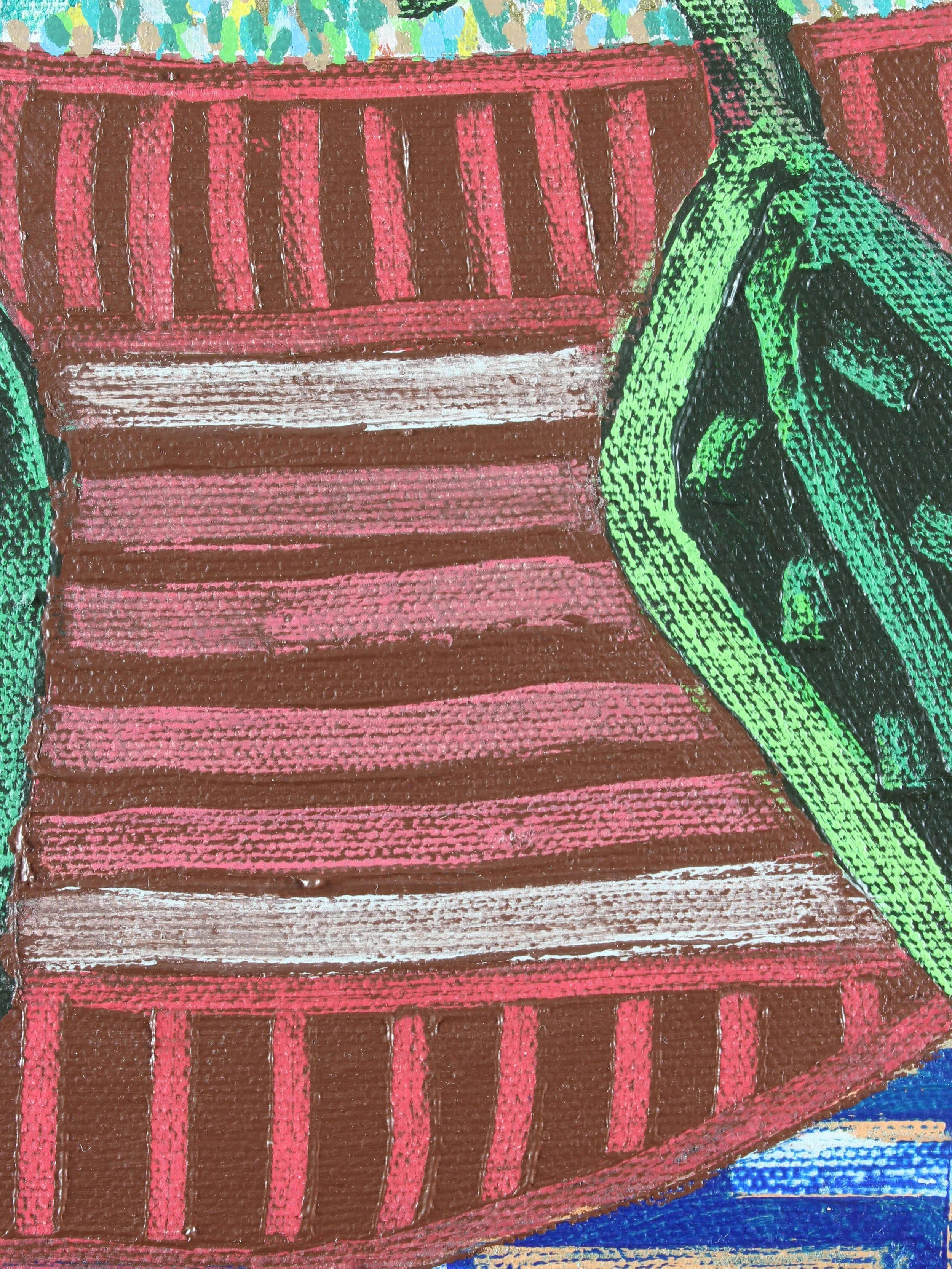 This work emerges from the encounter between the ordinary and the sacred. A plant, silent witness of inner time, becomes the protagonist of a sensory and symbolic universe. Material, line, color, surface does not imitate, but invokes: patterns engage with memory, the home transforms into an altar, and the common object acquires spiritual resonance. Here, the pictorial gesture does not merely represent it translates a way of being in the world. The plant is not just a vegetal being; it is a metaphor for care, for silent growth, for persistence within the intimate. Space becomes vibration, structure, a visual poem. This piece is an affirmation of the vital: of the energy held in the minimal, of art as an act of attention and contemplation.